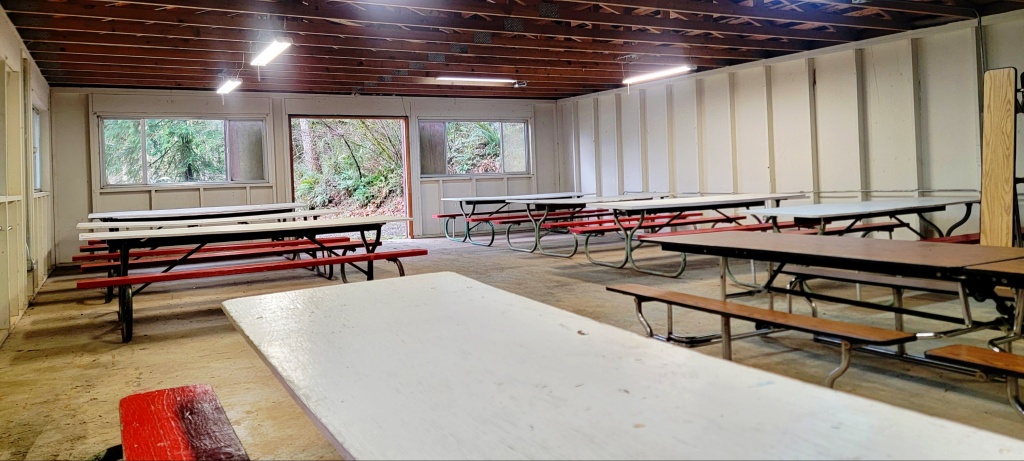 Recreation Building – Located on the lower-level campground near the lakefront, this building contains multiple tables w/colorful bench style seating for up to approx. 50 people. The kitchen is equipped with a food service preparation table, side-by-side refrigerator, sandwich cooler, halogen cooktop range, dishwasher, and two moderately sized chest freezers. There is also a dual-purpose sink available for your clean-up needs.
